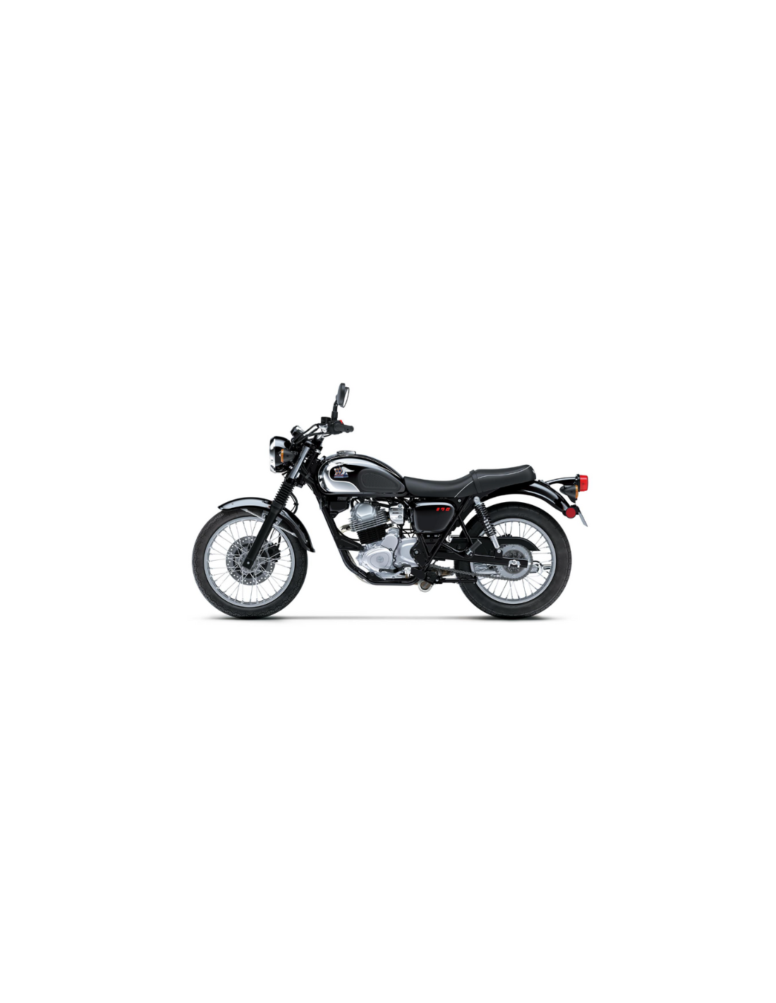 A vintage-style seat design with white piping, steel fenders front and rear, and spoked wheels give the Meguro S1 a look reminiscent of the original Meguro models and produce a look classic motorcycle fans will appreciate.